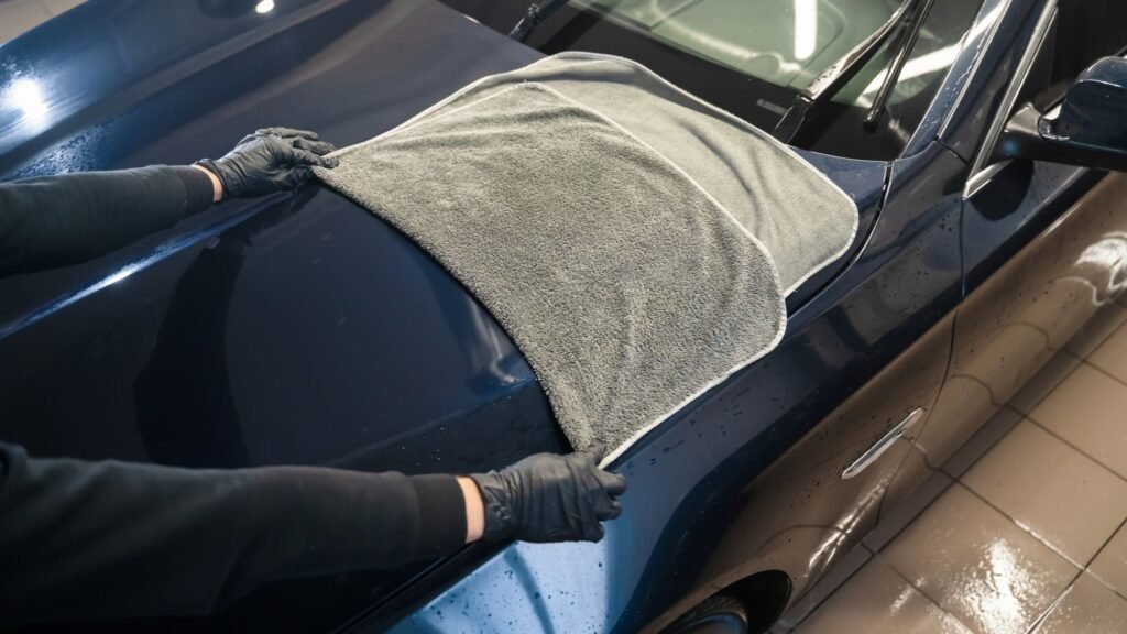 Grab a large, high-pile microfiber drying towels (waffle or plush, 800–1200 GSM) — think The Rag Company Liquid8r or Eagle Edgeless 600 — because size and absorbency cut the number of passes and reduce contact. Work top → down while panels are still wet: lay the towel flat, pat to absorb, then drag once across the panel with light, even pressure. Don’t scrub or spin the towel in circles — that’s how swirls start.