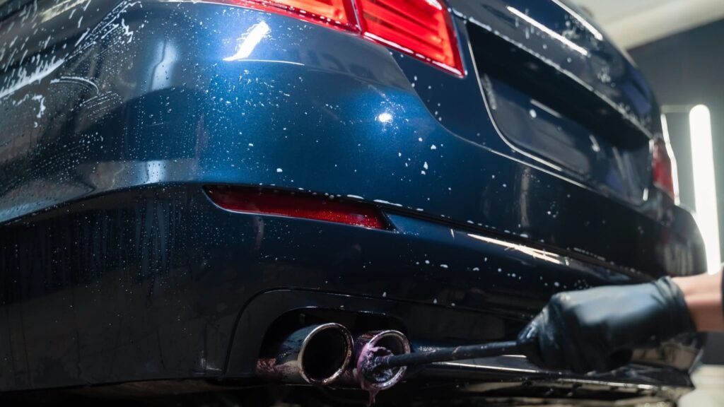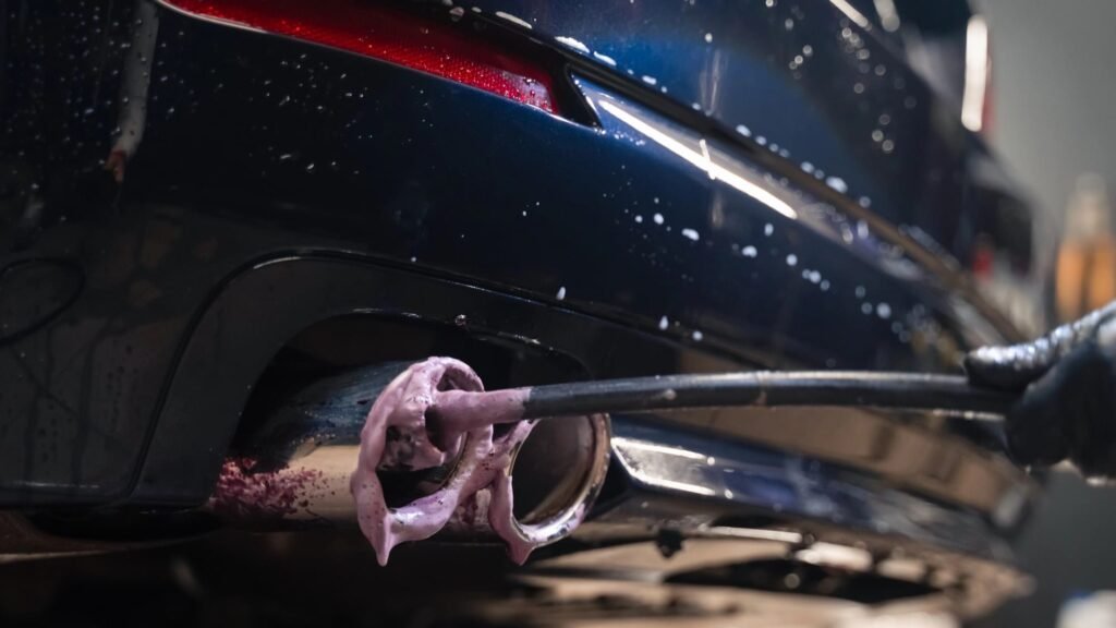 Leave the pipe to cool completely. Heat + cleaners = burns — let it sit or wear heat-resistant gloves if you must work warm. Tape off nearby paint/bumper seams with painter’s tape to avoid splash damage.