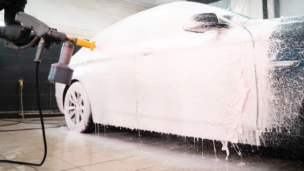 If you don’t have a foam cannon, a low-pressure foam lance or generous dilution in a spray bottle still helps — the goal is to lift grit off the clearcoat before contact.