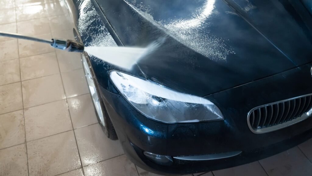- If the car is very dirty, do a quick foaming pre-soak with a low-pressure foam lance before the pressure rinse — it softens tar and bugs for easier removal.