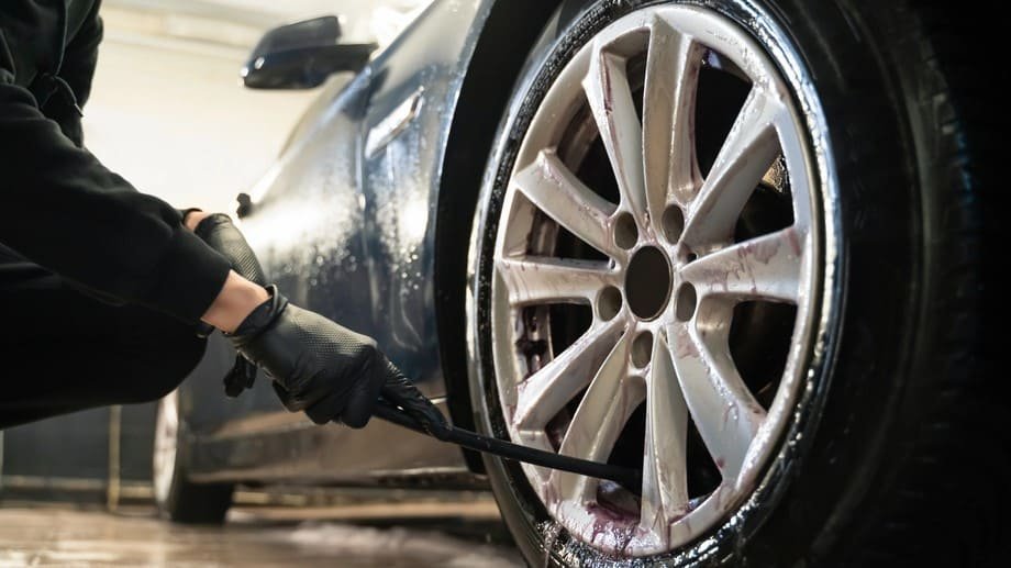 Tools matter: use a soft wheel brush for faces, a narrow wheel-barrel brush to reach the inner barrel, a small boar-hair or nylon detail brush for lug-nut wells, and a long-handled wheel-well brush for the arches. Agitate gently — short, decisive strokes — then flush thoroughly with a wide-fan rinse. For painted calipers or coated wheels, avoid steel-wire brushes and high-pressure jabs close up; angle the spray and keep 12–18 inches distance.