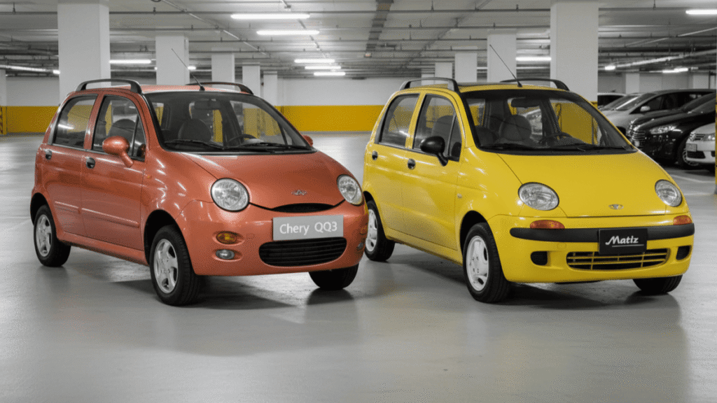 On the left the Chery QQ which is a copycat of the Daewoo Matiz on the right. Back in the day Chinese car makers focused on mimicking foreign car designs before they started bringing in well-known designers to help create some cool original looks.